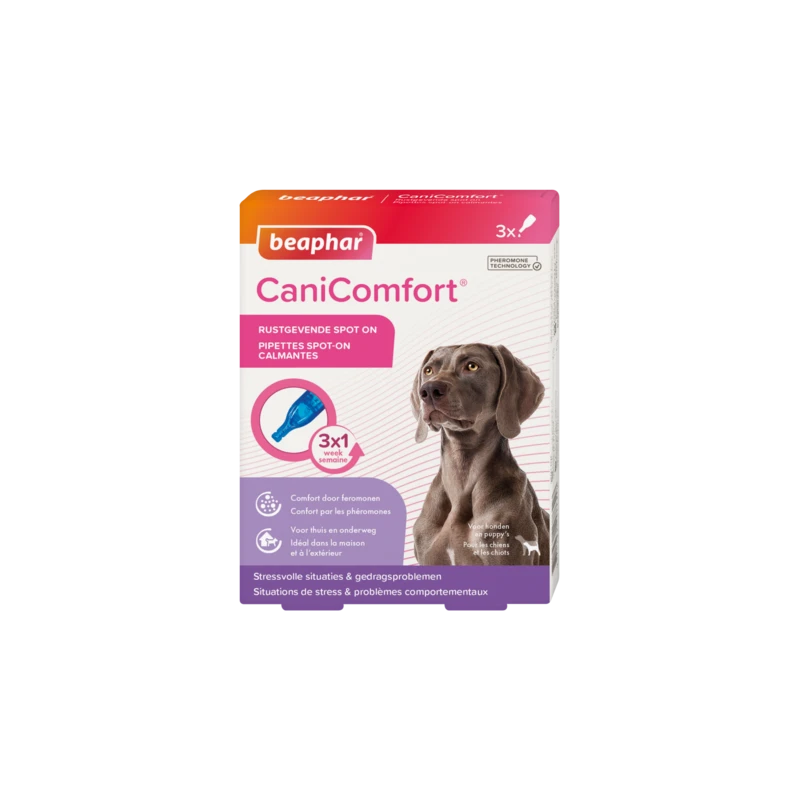 La phéromone diffusée par CaniComfort® de Beaphar apaise et réduit les problèmes comportementaux des chiens et des chiots. Le Spot On est idéal pour les chiens qui sont confrontés à de nouvelles expériences comme le processus d’apprentissage ou de socialisation, un changement d’environnement, un déménagement ou encore lors de situations stressantes comme un orage, un feu d’artifice ou des bruits forts. Les pipettes CaniComfort® de Beaphar conviennent à toutes les races de chiens dès lors qu’ils quittent la portée. Elles sont idéales à la maison ou à l’extérieur, notamment en voyage ou en séjour au chenil.