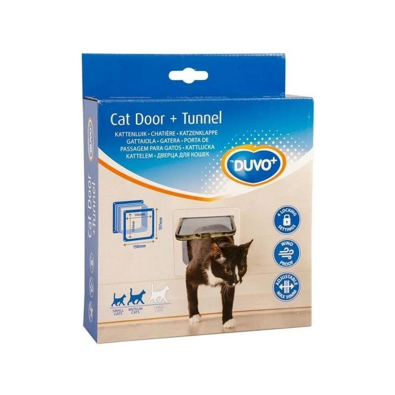 Cette chatière transparente de Duvo+ munie d’un cadre blanc est fabriquée avec des matériaux durables et inaltérables. Grâce aux 4 possibilités de fermeture, vous et votre chat bénéficiez de plus de liberté. Vous pouvez fermer complètement la trappe, l’ouvrir dans les deux sens ou uniquement dans un des deux sens. En d’autres termes, votre chat peut seulement entrer ou seulement sortir. La trappe est équipée d’un clapet magnétique à fermeture automatique qui permet de bien fermer la porte et de garder votre habitation à l’abri des courants d’air. Ce modèle convient aux races de chats de petite et de moyenne taille, vérifiez toujours à l’avance que les dimensions correspondent à votre chat. Le tunnel ajustable convient aux murs et portes de 50 mm d’épaisseur maximale. Vous retrouverez un patron en papier dans l’emballage, ainsi vous pourrez facilement monter la chatière. Collez le patron sur la porte et découpez le contour de la porte.