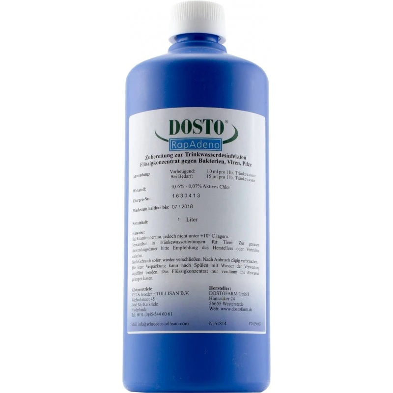 Le législateur autorise l’addition de 3 % (30 ml/litre) de RopAdeno® à l’eau potable et estime que cette concentration est absolument sans danger pour l’homme et l’animal. Ce dosage offre une protection fiable et est à utiliser pour le maintien de la santé (via l’eau de boisson). La flore intestinale est préservée.
