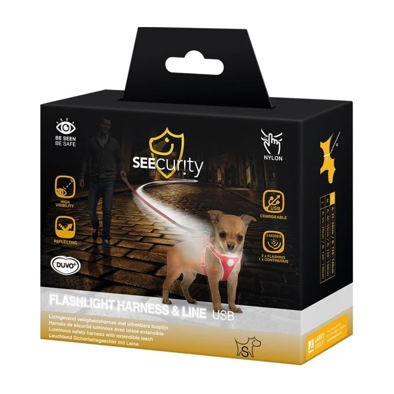 La visibilité et la sécurité sont deux notions clés qui caractérisent la gamme SEEcurity de Duvo+. Les harnais et laisses réfléchissants et lumineux avec éclairage LED garantissent une visibilité optimale dans l’obscurité pour pouvoir vous promener en toute sécurité avec votre chien. Pratique, ajustable en fonction de la taille de votre chien et rechargeable via USB.