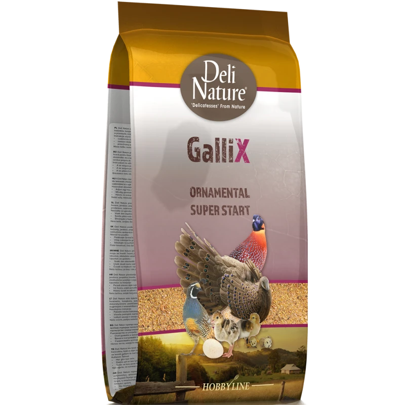 Aliment d’élevage complet et de haute qualité convenant à tous les poussins de volailles. GalliX Super Start est un aliment d’élevage unique, composé de céréales, graines, cake aux oeufs, gammares, daphnies et vers de farine séchés. Sa finesse facilite l’ingestion. Ce mélange riche en protéines avec ajout de toutes les vitamines et de tous les minéraux essentiels assure un démarrage idéal aux poussins. Les matières premières et les sousproduits soigneusement sélectionnés garantissent une croissance équilibrée, une constitution solide et une bonne implantation des plumes (pour obtenir un beau plumage). GalliX Super Start est extraordinairement bien adapté aux poussins d’espèces de volailles d’ornement exclusives telles que les francolins, tragopans, paons, etc.