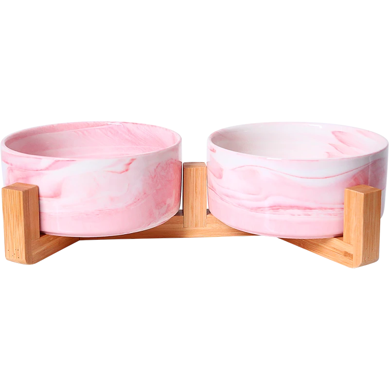 Gamelle Double en Céramique Rose Marbré avec support en Bambou 2x850ml – Animal Boulevard