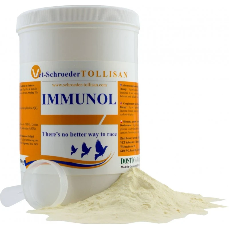 Pendant l’elevage, donner deux jours dans la semaine de l’Immunol, comme indiqué précédemment. Uniquement lorsque les pigeons d’élevage nourrissent leurs jeunes et pas lorsqu’ils couvent afin d’éviter qu’ils ne s’engraissent.