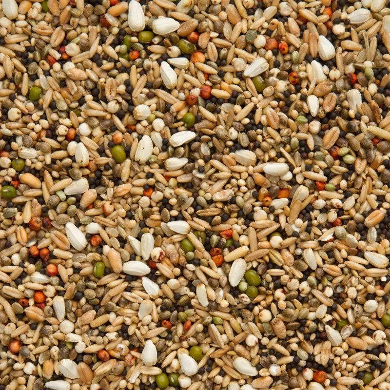 Avoine pelée 20%, colza 15%, millet blanc 12%, chanvre 9%, alpistes 8%, dari blanc 7,5%, cardi 5%, froment 5%, graines de sésame 5%, riz cargo 5%, sorgho extra rouge 5%, katjang idjoe 3,5%