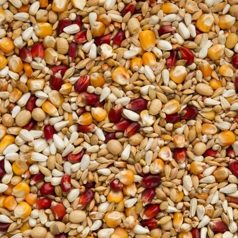 Riz paddy 19%, cardi 14%, maïs bordeaux 11%, maïs cribbs 10,5%, orges 10%, dari blanc 6%, maïs plata 6%, avoine pelée 5%, froment 4%, sorgho rouge 4%, soja torrefié 3,5%, chanvre 2%, lentilles 2%, colza 1%, graines de sésame 1%, riz cargo 1%