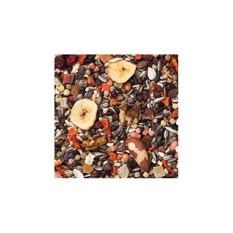 Est un mélange idéal pour les perroquets africains. Grâce aux tournesols noirs, noix et noix du Brésil, … il répond parfaitement aux besoins de ces oiseaux. Ces espèces de perroquets demandent un taux élevé de graisse dans leur alimentation. Le mélange est enrichi avec du grit pour oiseaux, des extrudés (contenant des vitamines supplémentaires, acides aminés, des oligo-élements).