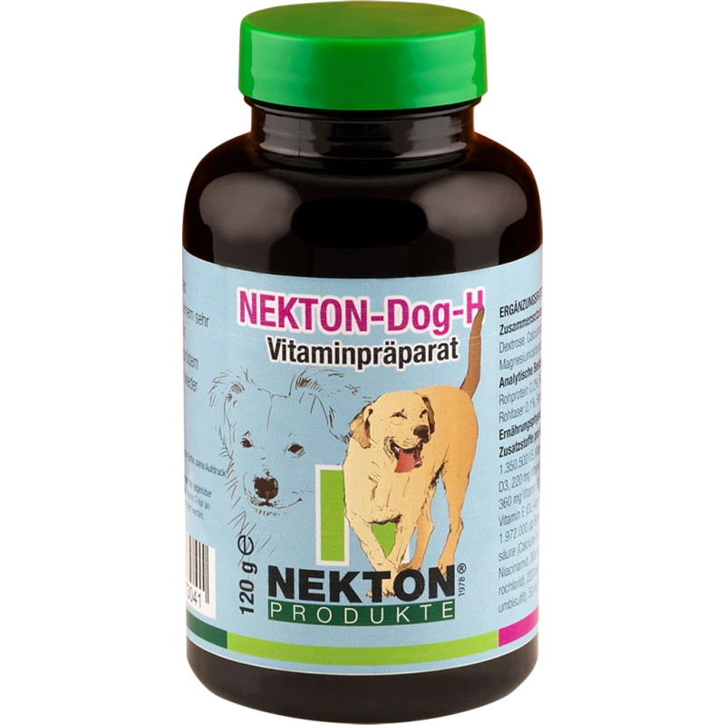 NEKTON-Dog-H est une préparation à base de vitamines, qui contient toutes les vitamines indispensables à l’organisme du chien ainsi qu’une très grande proportion de biotine, plus de 2 millions mg/kg. NEKTON-Dog-H permet au pelage d’être brillant et de constituer de façon remarquable. NEKTON-Dog-H est extrêmement efficace pour lutter contre des poils rêches et secs, des tâches claires anormales ou des altérations de la peau. La biotine participe à une multitude de réactions métaboliques importantes et soutient la croissance, l’assimilation de la nourriture ainsi que la reproduction du chien. Mais l’une des fonctions essentielles de la biotine reste son influence forte sur la peau et le pelage du chien. Durant l’utilisation de NEKTON-Dog-H, aucune autre préparation à base de vitamines ne doit être administrée.