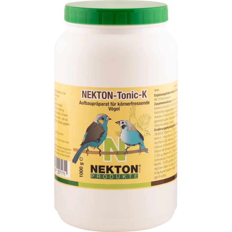 Les produits NEKTON-Tonic se distinguent tout particulièrement par le fait que les 60 substances qu‘ils contiennent apparaissent toutes sous une forme entièrement minéralisée, ce qui leur permet d‘être disponibles pour l‘organisme immédiatement après l‘administration, sans peser sur les organes digestifs. Aide l‘oiseau en cas de maladies, lors de l‘élevage des petits, et chez les animaux souffrant de malnutrition. NEKTON-Tonic peut également, en cas de besoin, être administré pendant un certain temps comme aliment unique.