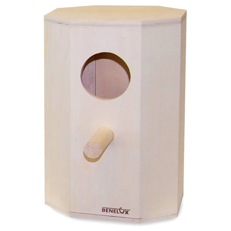 Nid en bois pour perruches avec ouverture latérale et crochet de sécurité.