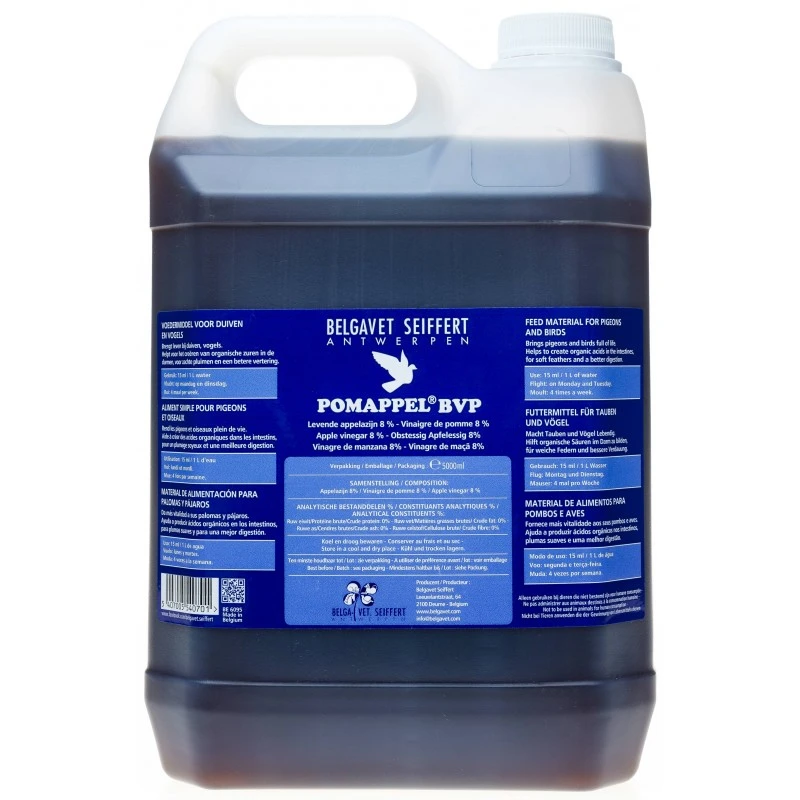 8% vinaigre de pomme vivant qui rend les pigeons pleins de vie. Idéal pour former des acides organiques dans les intestins. Rend le plumage plus soyeux. Pour une meilleure digestion.