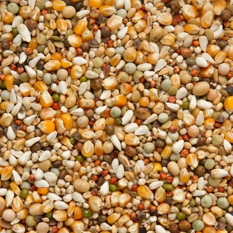 Dari blanc 15,8%, maïs popcorn 15,1%, froment blanc 12,6%, petit maïs cribbs 9,8%, cardi 9,3%, sorgho extra rouge 6,9%, vesces 4,7%, lentilles 3,5%, avoine pelée 3,2%, soja torrefié 3,2%, katjang idjoe 2,9%, riz cargo 2,6%, petits pois verts 2,3%, maple peas 1,9%, petits pois jaunes 1,9%, sarrasin 1,5%, riz paddy 1,2%, winterpeas 1%, chanvre 0,6%
