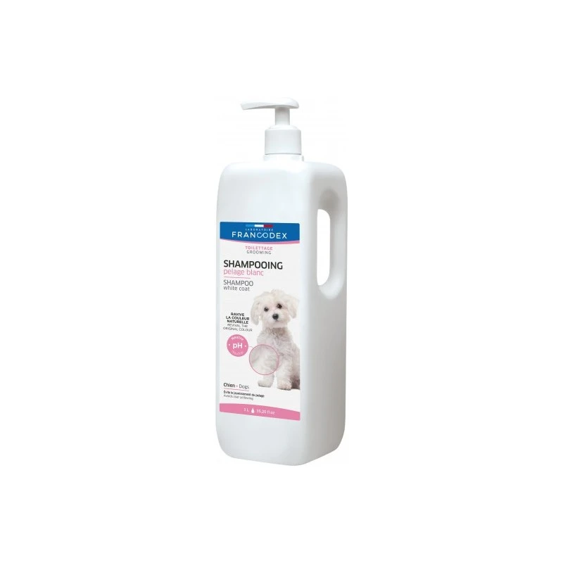 Le SHAMPOOING PELAGE BLANC FRANCODEX ravive la couleur blanche naturelle du poil grâce à la vitamine B3 aux propriétés éclaircissantes.
