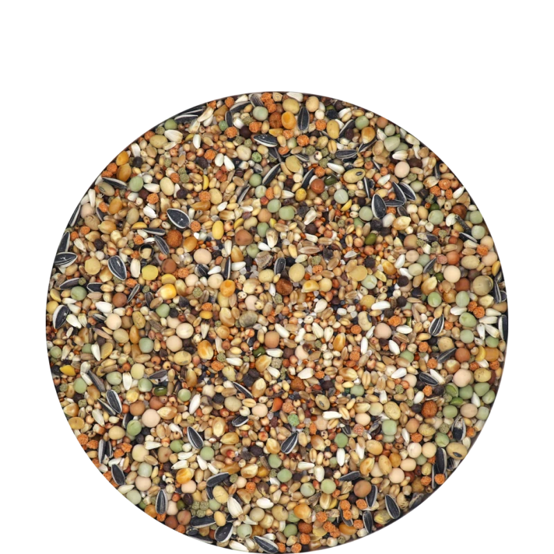 Petit maïs cribs 6%, Graines de soja toasté 6%, Maple peas 1%, Dun peas 2%, Pois jaunes 5%, Petits pois verts 5%, Vesces 3%, Katjang idjoe 1%, Froment blanc 21%, Dari jaune 4%, Milo 16%, Cardy 6%, Brisures de riz 6%, Petits graines de tournesol strié 1%, Chanvre 1%, Sarrasin 2%, Alpiste 0,5%, Millet jaune 1%, Graines de lin brun 1%, Graines de lin jaune 0,5%, Graines de colza noir 3%, Graines de chardon-Marie 0,5%, Carrot corn 0,5%, Herba corn 1%, Millet rouge 6%