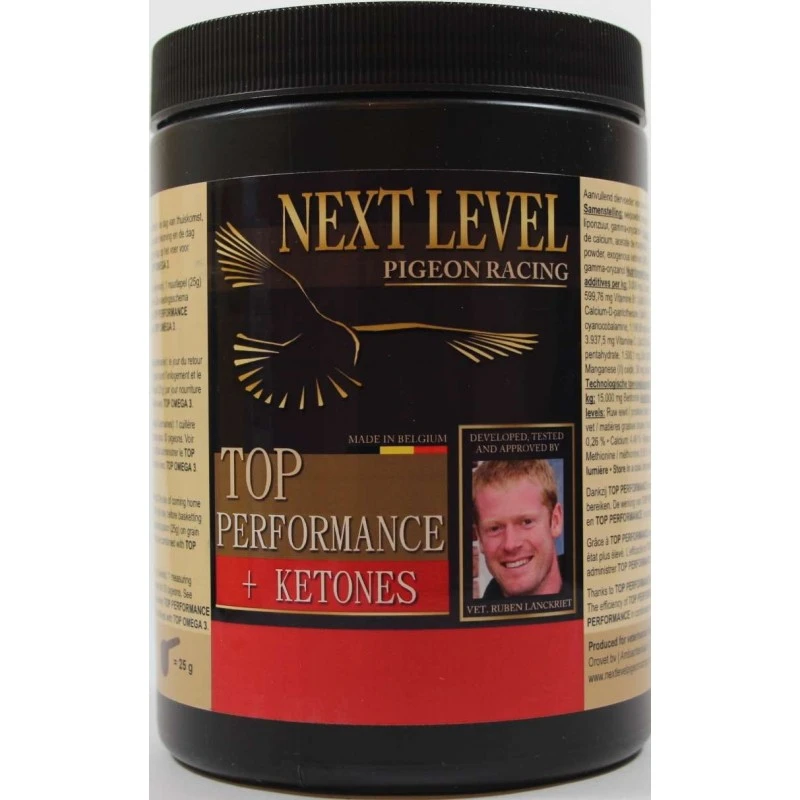 Grâce à TOP PERFORMANCE (poudre) avec cétones, les pigeons vont récuperer plus vite et leurs condition va àméliorer. Le bon fonctionnement de TOP PERFORMANCE augmente par appliquer le système NEXT LEVEL et utiliser TOP PERFORMANCE en combinaison avec TOP PROTEIN, TOP AMPUL et TOP RECUP.
